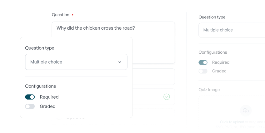 Build assessments your way: multiple choice, single choice, drag-and-drop, ordering tasks, or even open-ended questions with AI-powered grading. You can even generate entire quizzes in seconds with AI.