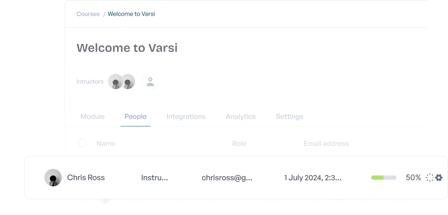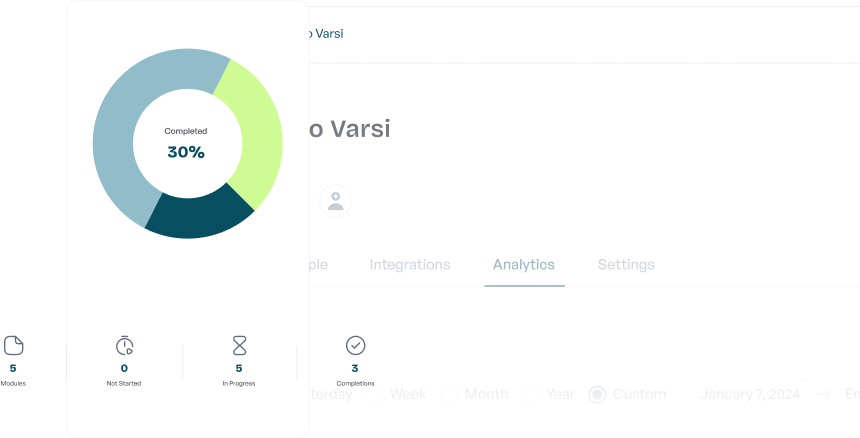 Know who's engaging and how. Varsi shows you lesson completions, quiz performance, and time spent—so you can support those who need it, and celebrate those who get it.