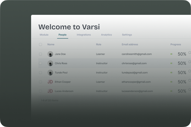 Know who's engaging and how. Varsi shows you lesson completions, quiz performance, and time spent—so you can support those who need it, and celebrate those who get it.